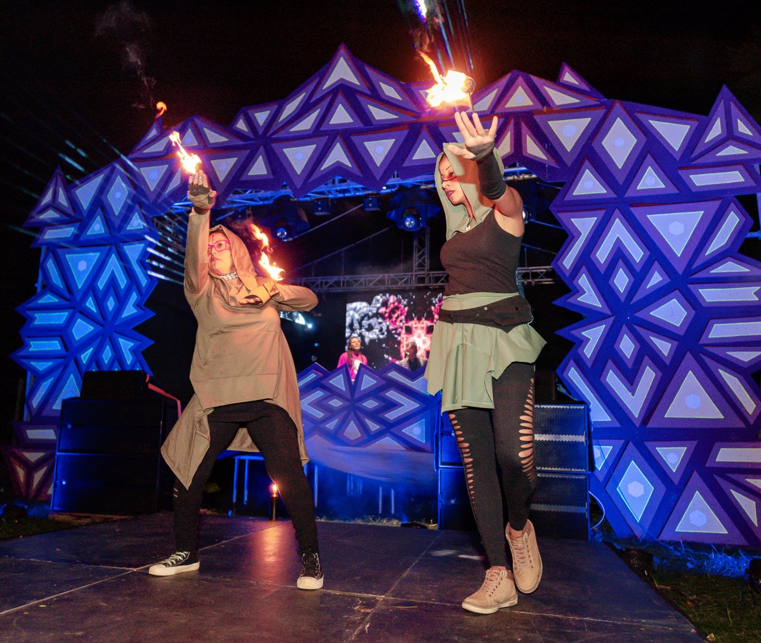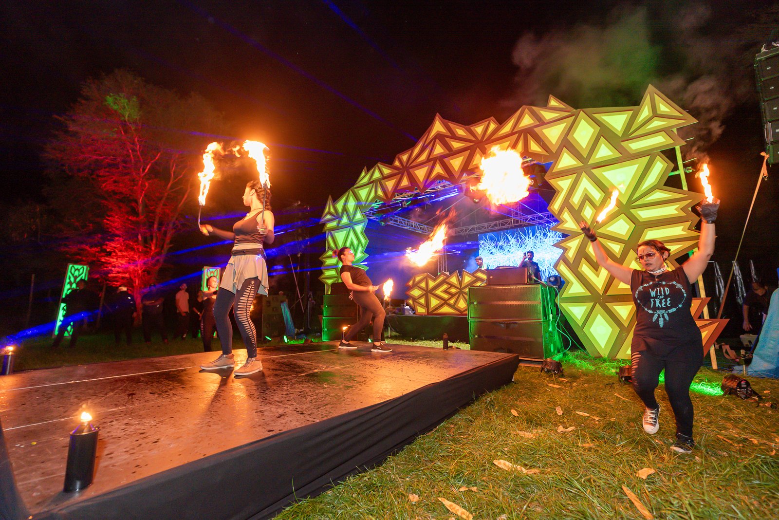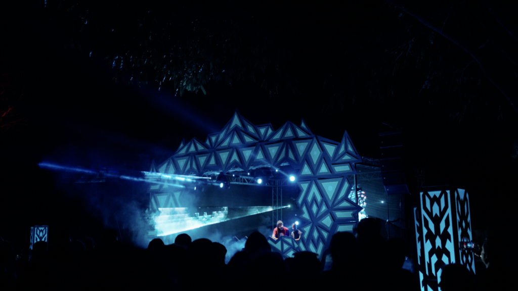 Each stage is uniquely designed using wood structures and integrated LED screens, balancing raw craftsmanship with modern visual storytelling.